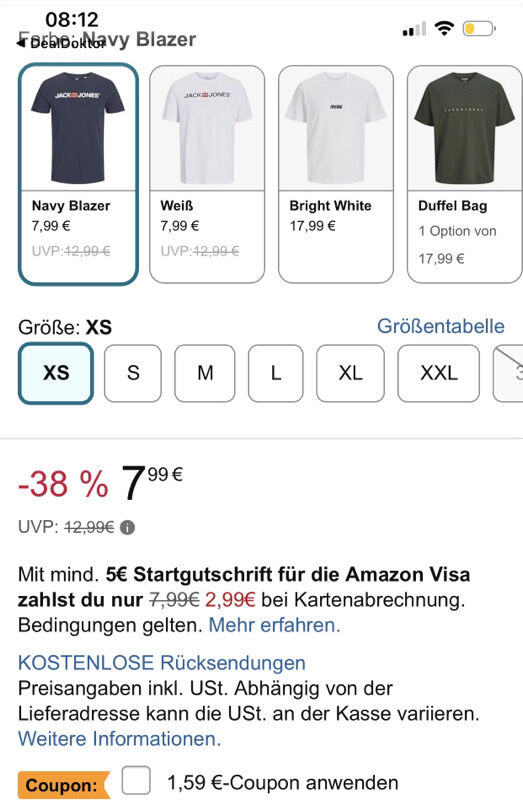 Derzeit bekommen Amazon Prime Mitglieder folgendes Angebot: JACK & JONES Male T-Shirt in dunkelblau oder in weiß für 6,40€