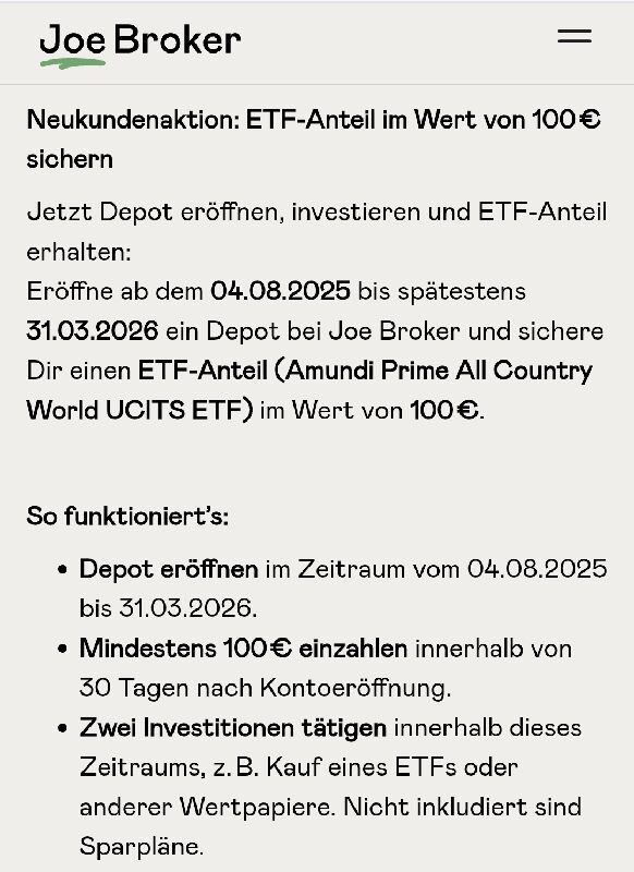 Registriere dich als Neukunde bei Joe Broker, zahle innerhalb von 30 Tagen nach Eröffnung mindestens 100€ ein und tätige zwei Investitionen (kein Sparplan!!!), erhältst du einen ETF-Anteil (Amundi Prime All Country World UCITS ETF) im Wert von 100 €. Gutschrift erfolgt spätestens vier Wochen nach Aktionsende am 31.03.2026. Joe Broker ist eine Marke der TARGOBANK AG.