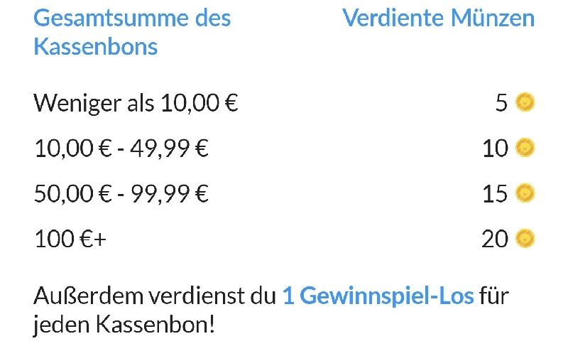 Pro Woche kann man mit den Kassenzetteln 150 Coins sammeln danach werden Kassenzettel „ignoriert“ man kann sie aber sammeln und nächste Woche einreichen.