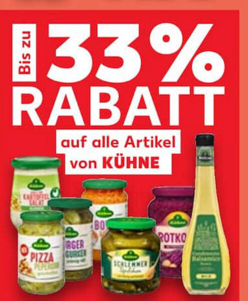 Beim Kauf von Kühne Gurken und Gemüse in Essig Gläsern (ohne Rotkohl, Grünkohl, Sauerkraut) nach Wahl im Wert von insgesamt mindestens 4 € erhältst Du 1,50 € Sofort-Rabatt. Dein Rabatt wird direkt an der Kasse von der Rechnungssumme abgezogen.