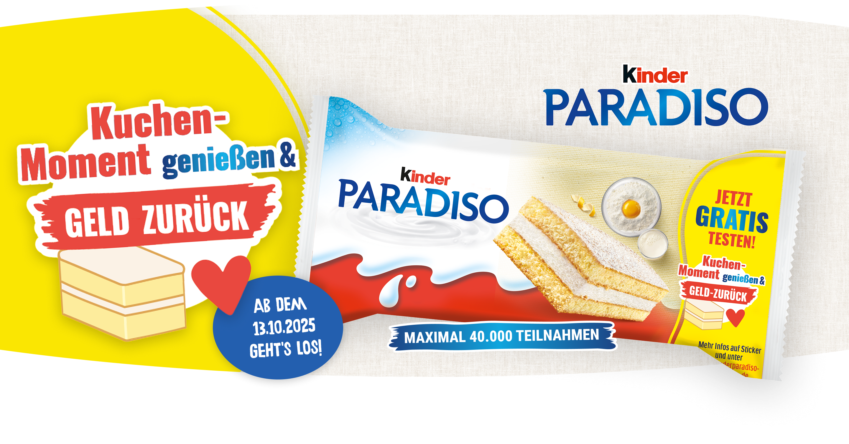 Eine kinder Paradiso 4er-Aktionspackung im Zeitraum vom 13.10. bis 31.12.2025 erwerben. - Beleg und Aktionspackung inkl. Aktionshinweis fotografieren