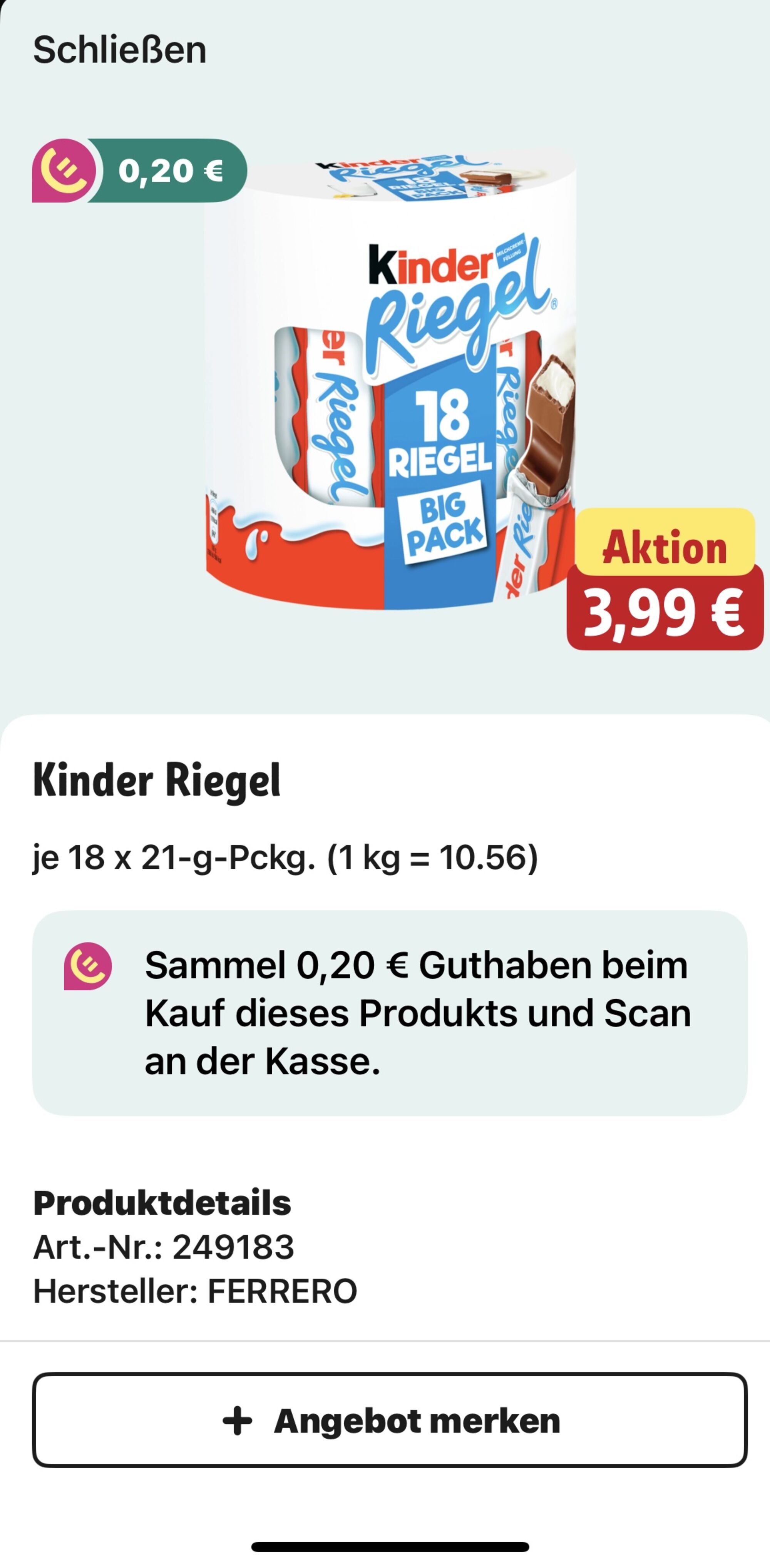 bei Rewe nächste Woche die kinder Riegel mit 0,20€ Gewinn auf das Rewe Bonus Konto möglich