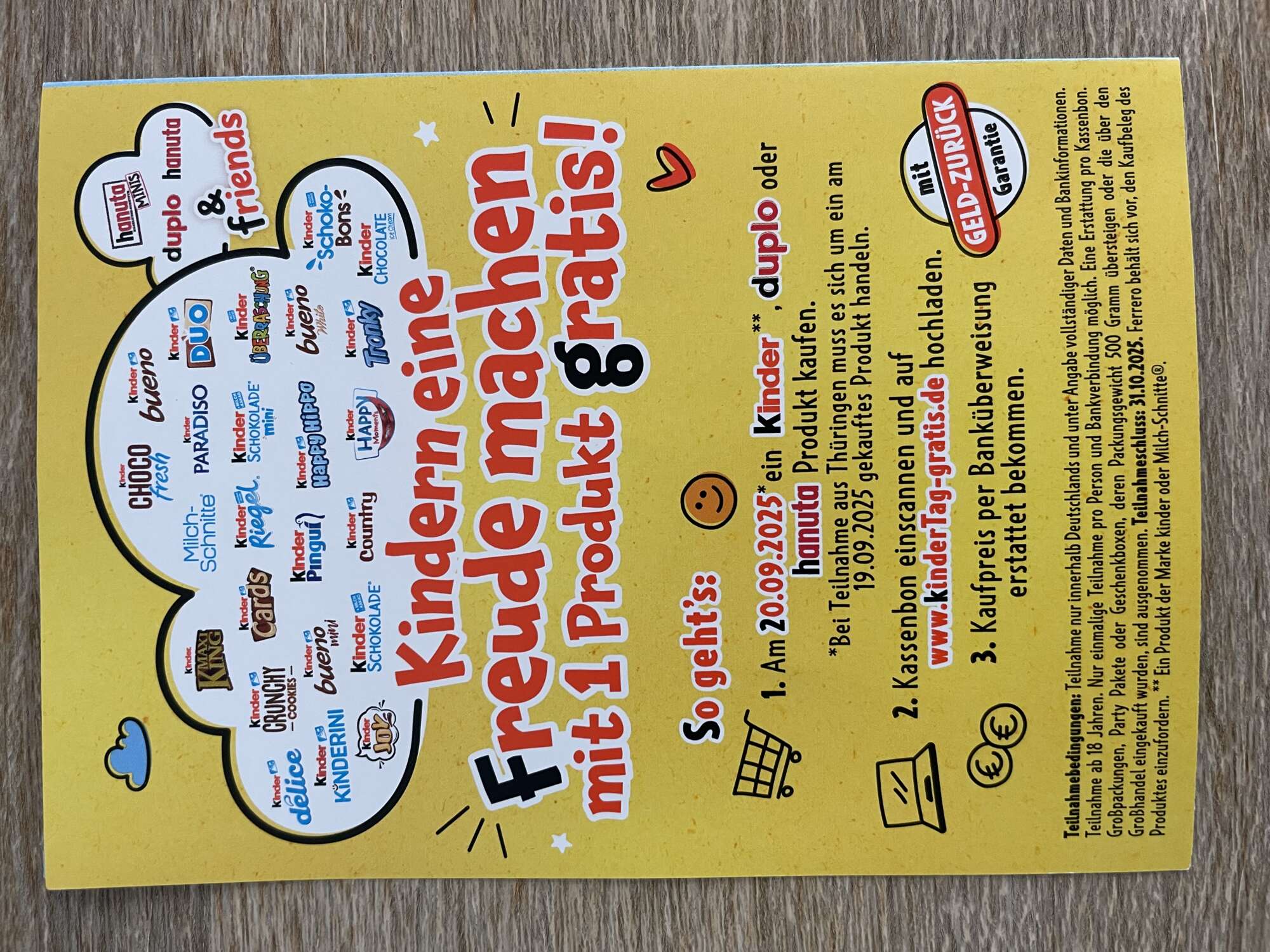 - Am 20.09.2025 (in Thüringen: 19.09.) ein Aktionsprodukt von kinder (bis max. 500g) kaufen.