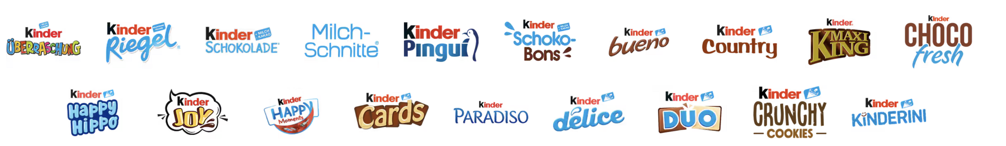 Alle Einzelprodukte der Marken kinder bis max. 500g, dies sind: kinder Riegel, kinder Bueno, kinder Schokolade, kinder Country, Milch-Schnitte, kinder Pingui, kinder Happy Hippo, kinder Chocofresh, kinder Maxi King, kinder Schokolade Eis, kinder Happy Moments, kinder Schokobons, kinder Überraschung, kinder Joy, kinder Paradiso, kinder Duo, kinder CrunchyCookies, kinder Cards, kinder Delice, kinder Kinderini, duplo, hanuta oder hanuta Minis.