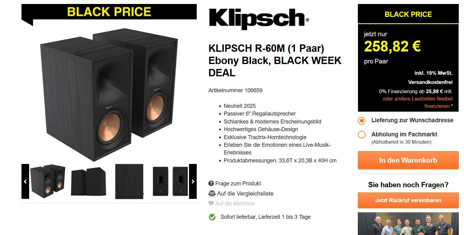 Bei enzinger sind die Klipsch R-60M Boxen (1 Paar) zum Black Price von 258,82€ inkl. Versand verfügbar. Deal ist bereits aktualisiert 😉