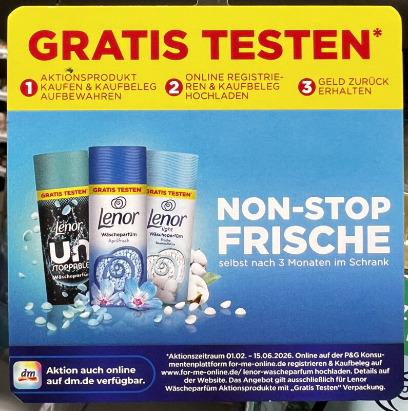 Wenn ihr dabei sein und Lenor Wäscheparfüm gratis testen wollt, müsst ihr euch nicht länger gedulden! 😊 Die Aktion ist bereits am 01.02.2026 gestartet und dauert bis 15.06.2026. Einsendeschluss für den Upload eures Kassenbons ist der 30.06.2026.