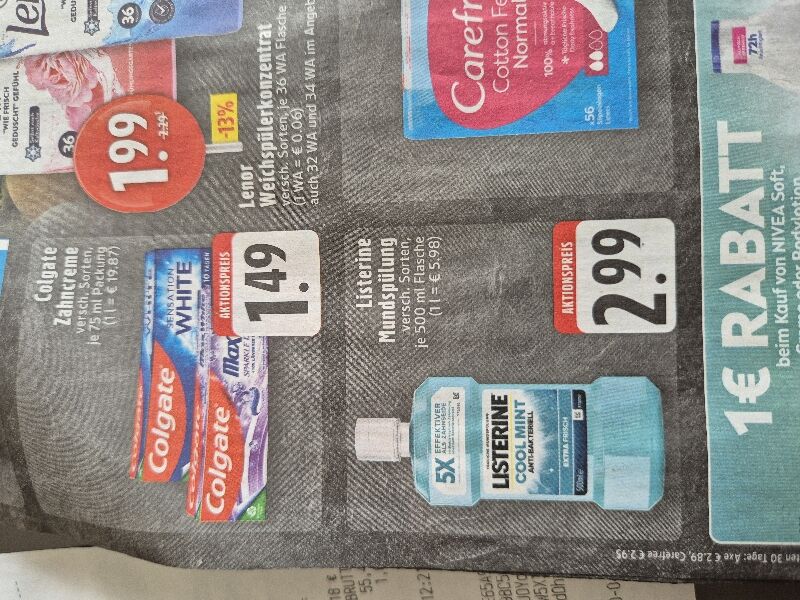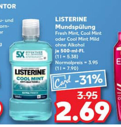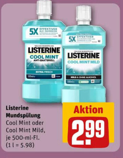 Habe gerade gesehen, dass die Cool Mint und Cool Mint milder Geschmack (500 ml) bei Rossmann im Angebot sind. Sie kosten 3,49 €. Evtl. noch 10% Coupon verwenden, dann sind es nur noch 3,14 €. Und somit für euch nur noch 1,14 €.