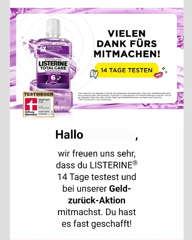 Jetzt könnt ihr LISTERINE gratis testen! đ Mit der aktuellen LISTERINE Cashback-Aktion könnt ihr eure Mundhygiene ganz einfach verbessern â und das komplett risikofrei. Kauft eine Aktionsflasche, testet sie mindestens 14 Tage lang und sichert euch anschlieĂend das Geld zurĂŒck. ZusĂ€tzlich habt ihr die Chance, ĂŒber ein Quiz attraktive Preise zu gewinnen. Ideal, um die MundspĂŒlung ausfĂŒhrlich im Alltag zu testen. Wichtig ist nur, dass ihr alle Teilnahmebedingungen einhaltet.Â
