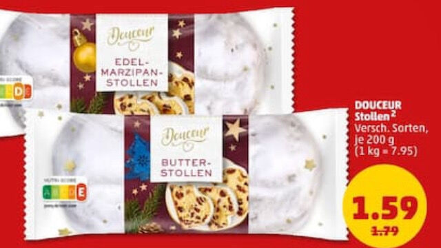 Auch bei Penny gibt es Stollen: entweder 1 kg für 8,99 € oder je 200 g für 1,59 €.