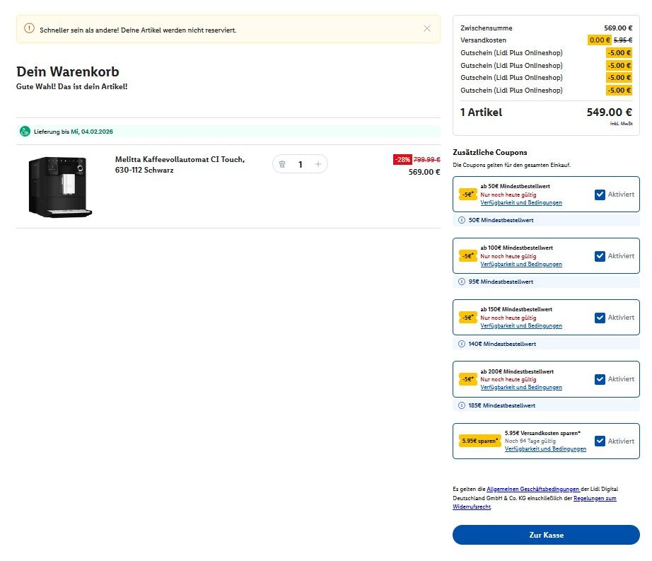 Im LIDL Onlineshop erhält man nur noch bis Mitternacht, durch die Aktivierung von 4x 5 Gutscheinen + dem 4,95€ Versandkostengutschein in der LIDL APP, den Melitta Kaffeevollautomat CI Touch 630-112 (Schwarz) zum Preis von 549€ inkl. Versand statt 569€ + 4,95 Versand. Die 4x 5€ Gutscheine sind nur noch heute gültig (siehe auch Bild in den Kommentaren)!