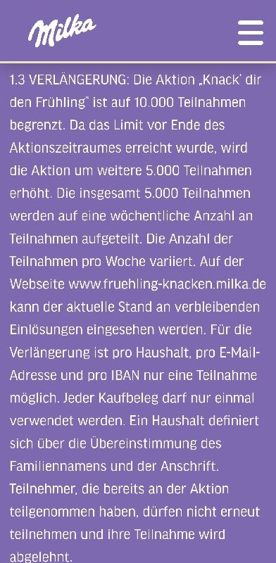 TNB wurden in Punkt 1.3 geändert: „1.3 VERLÄNGERUNG: Die Aktion „Knack‘ dir den Frühling“ ist auf 10.000 Teilnahmen begrenzt. Da das Limit vor Ende des Aktionszeitraumes erreicht wurde, wird die Aktion um weitere 5.000 Teilnahmen erhöht. Die insgesamt 5.000 Teilnahmen werden auf eine wöchentliche Anzahl an Teilnahmen aufgeteilt. Die Anzahl der Teilnahmen pro Woche variiert. Auf der Webseite http://www.fruehling-knacken.milka.de kann der aktuelle Stand an verbleibenden Einlösungen eingesehen werden.. Für die Verlängerung ist pro Haushalt, pro E-Mail-Adresse und pro IBAN nur eine Teilnahme möglich. Jeder Kaufbeleg darf nur einmal verwendet werden. Ein Haushalt definiert sich über die Übereinstimmung des Familiennamens und der Anschrift. Teilnehmer, die bereits an der Aktion teilgenommen haben, dürfen nicht erneut teilnehmen und ihre Teilnahme wird abgelehnt.“.