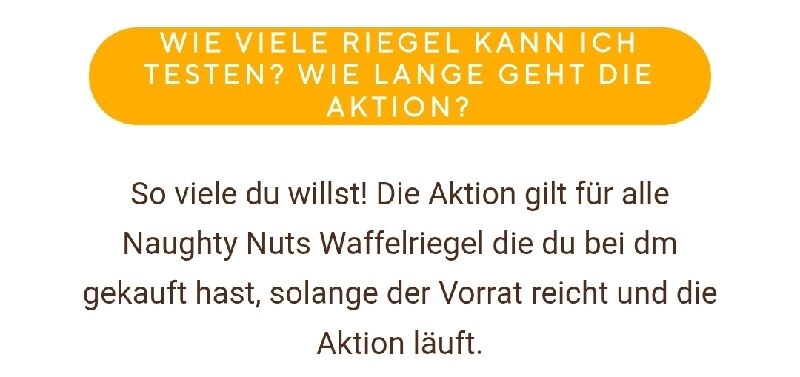 Wer bei der Aktion mitmachen und Naughty Nuts gratis testen möchte, sollte sich beeilen: Die Aktion ist bereits gestartet und dauert nur, solange der Vorrat reicht! NĂ€here Angaben zum Kontingent oder zur genauen Dauer der Aktion sind derzeit auf der Seite nicht zu finden – auch einen ZĂ€hler gibt es auf der Aktionsseite entsprechend nicht.Â