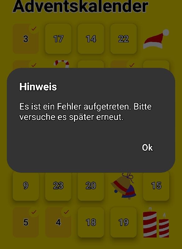 Kann mir vielleicht jemand bitte helfen? da wo man den Adventskalender anklicken kann, wird bei mir nicht angezeigt. Die App aktualisieren kann ich auch nicht. Deinstalliert habe ich sie auch schon.
