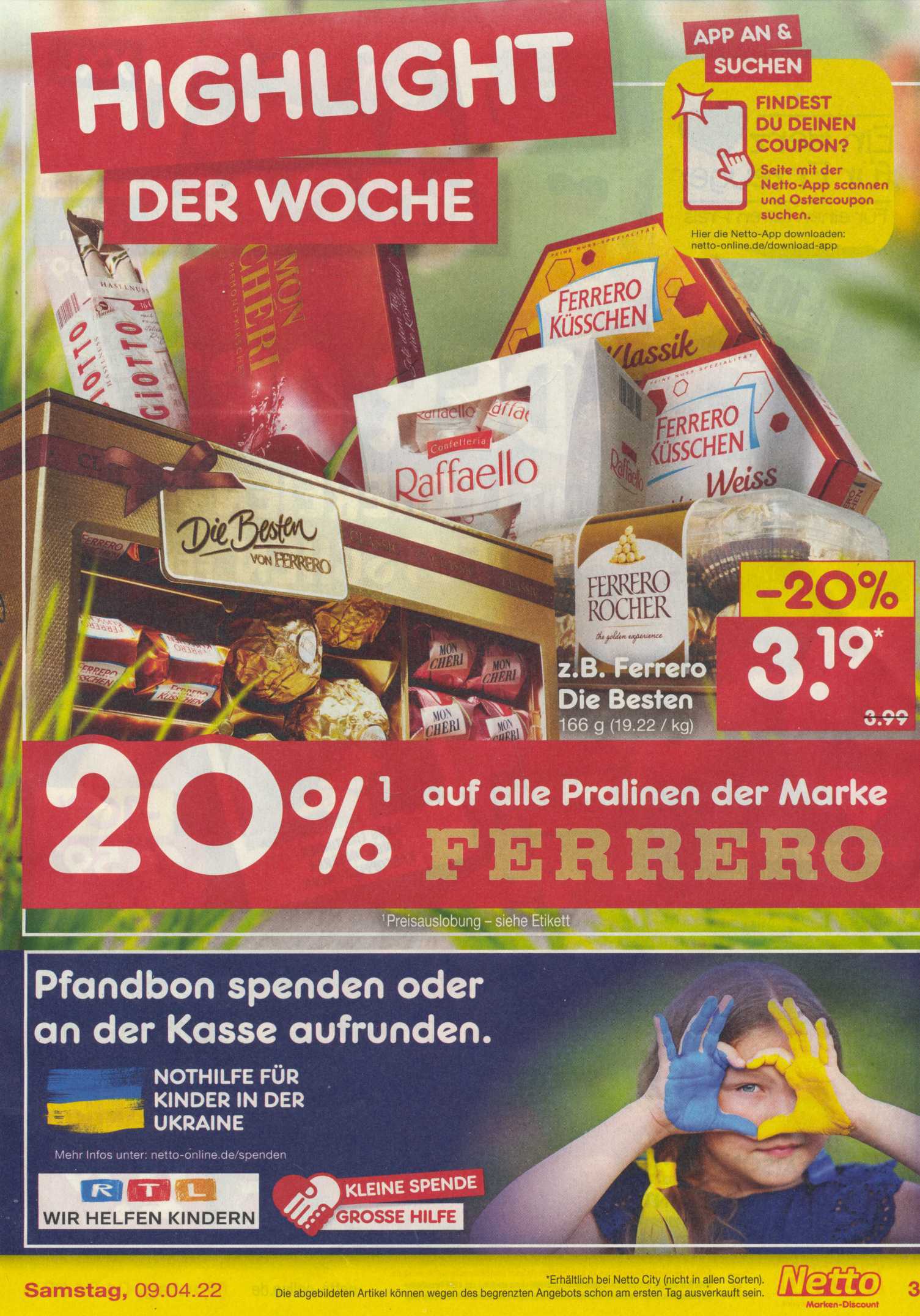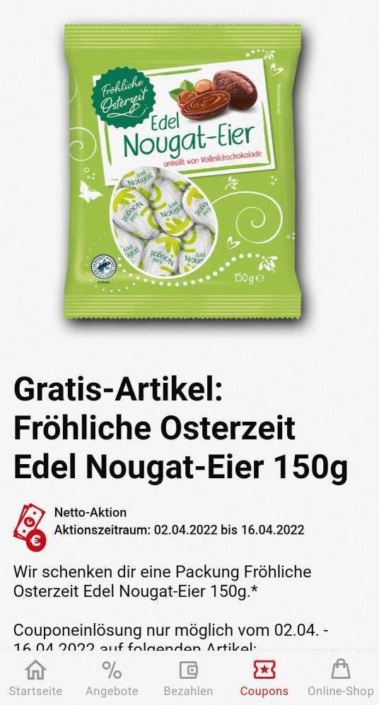 Wer mit der Netto-App die Seite 3 im Netto-Prospekt (gültig ab 04.04.) scannt, bekommt eine Coupon mit dem es „Fröhliche Osterzeit Edel Nougot-Eier 150 g“ gratis gibt.