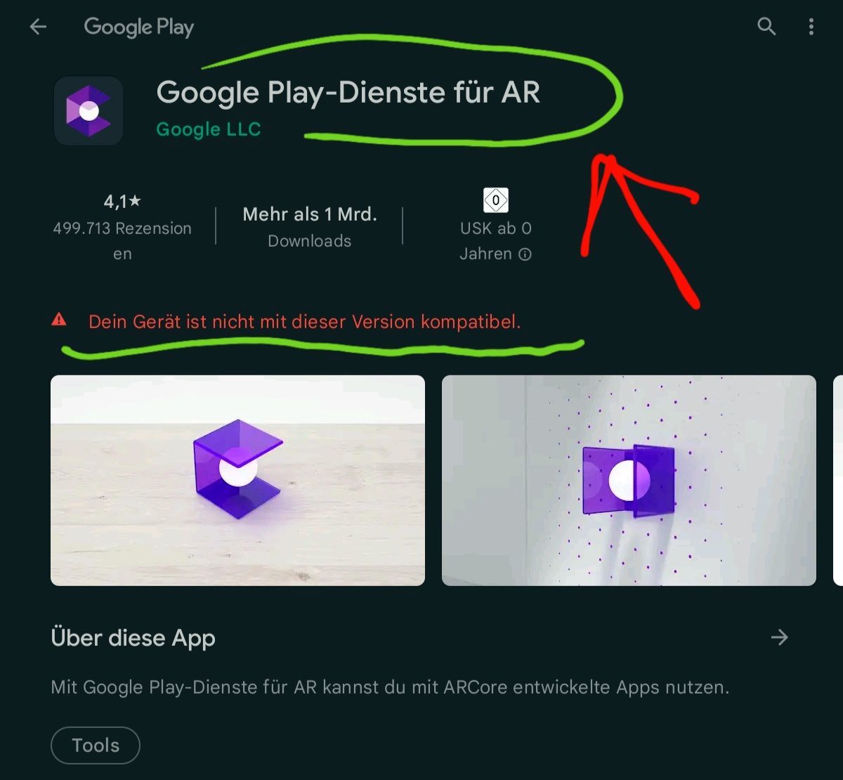 Wie gesagt: Das geht nur mit Geräten, die Augmented Reality von Google können. Bei meinem Samsung kommt: Dein Gerät ist nicht geeignet.