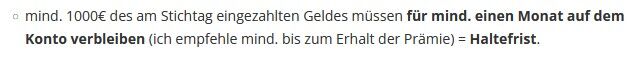 - mind. 1000€ des am Stichtag eingezahlten Geldes müssen für mind. drei Monate auf dem Konto verbleiben (ich empfehle mind. bis zum Erhalt der Prämie) = Haltefrist.