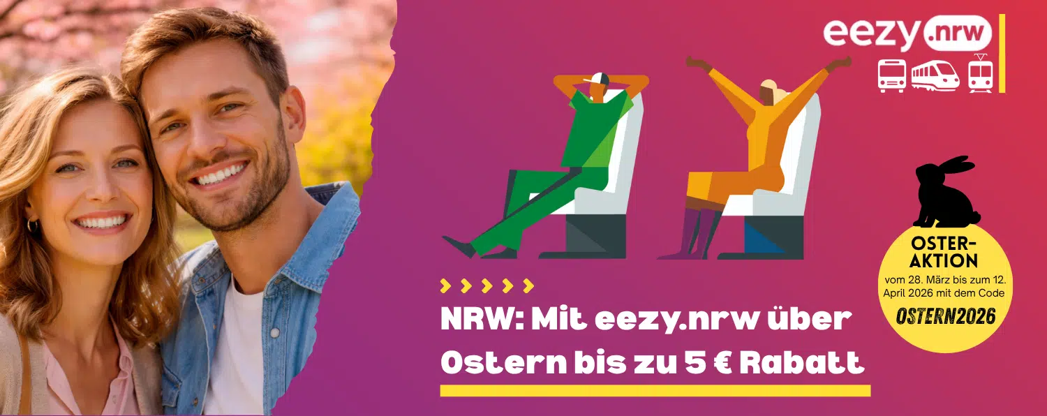 Pünktlich zu den Osterferien gibt’s in NRW wieder eine richtig nette Sparaktion: Vom 28.03. bis 12.04.2026 könnt ihr den ÖPNV mit eezy.nrw besonders günstig nutzen – mit dem Code Code wurde kopiert | OSTERN2026 spart ihr 5 € pro Fahrt. Je nach Strecke sind damit sogar komplett kostenlose Fahrten drin.