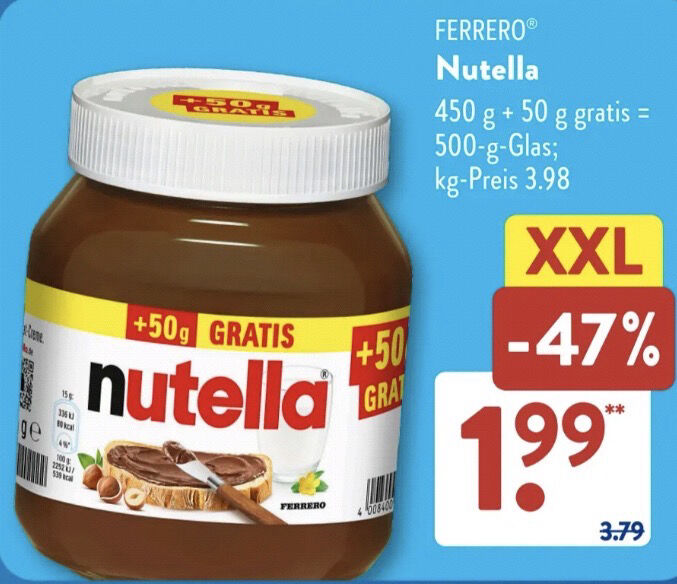 Die beliebte Nutella Nuss-Nougat-Creme im 500-g-Glas (450 g + 50 g extra) gibt’s jetzt bei Aldi Nord für nur 1,88 € statt 3,79 € – das sind satte 50% Ersparnis pro kg bei 3,76 €.
