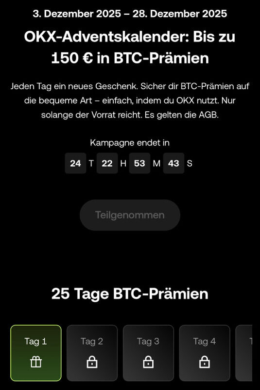 Aktuell gibt es eine Weihnachtsaktion bei der Nutzer noch zusätzlich bis zu 150 Euro in BTC bekommen können. Es sind jeden Tag verschiedene Aufgaben mit unterschiedlichen Boni.
