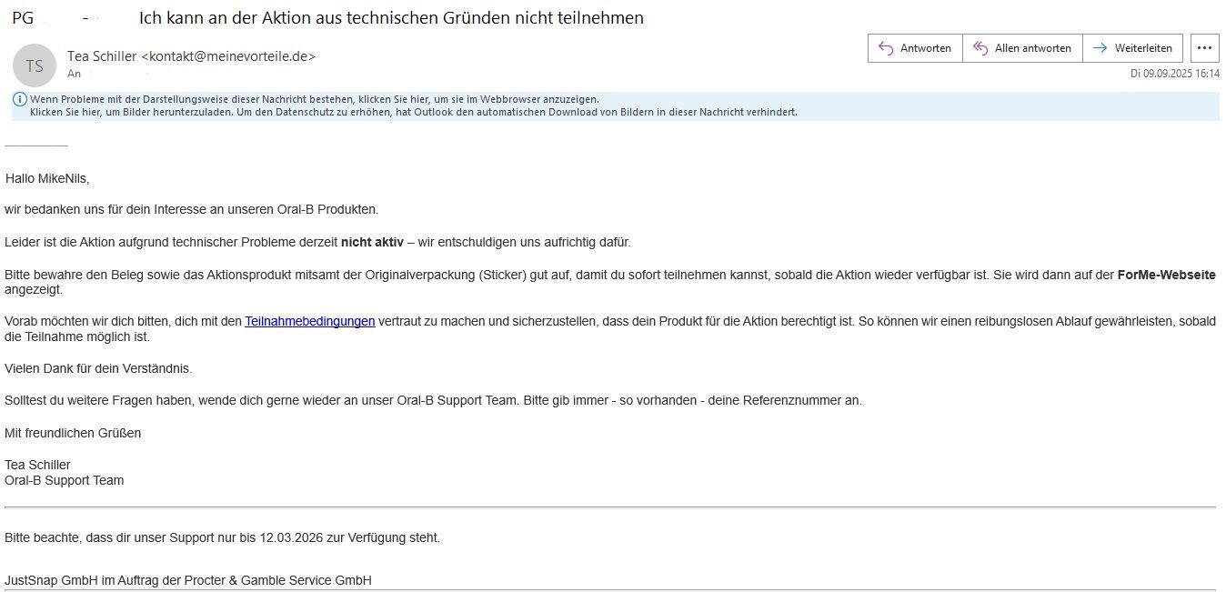 Wenn ihr auch dabei sein und Oral-B Zahnpasta gratis testen wollt, habt ihr noch eine ganze Weile Zeit, um an der Aktion teilzunehmen. Der Kaufzeitraum ist bereits am 01.09.2025 gestartet und dauert noch bis Ende des Jahres – also bis 31.12.2025. Nach dem Kauf habt ihr noch bis 15.02.2026 Zeit fĂŒr den Upload eures Kassenbons und die Teilnahme.