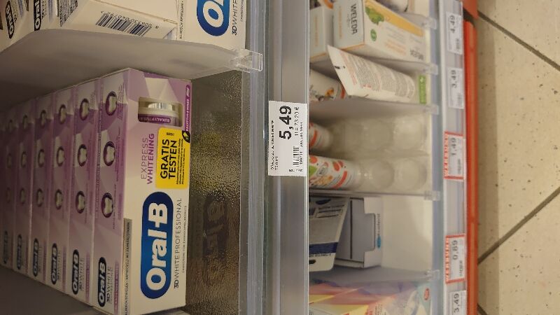 Rossmann – PLZ 65xxx – mit Sticker war die teure Sorte Pro 3D White Clinical KĂŒhle Minze fĂŒr 6,95 âŹ. Die anderen beiden preiswerteren Sorten ohne Sticker. Endlich erledigt.