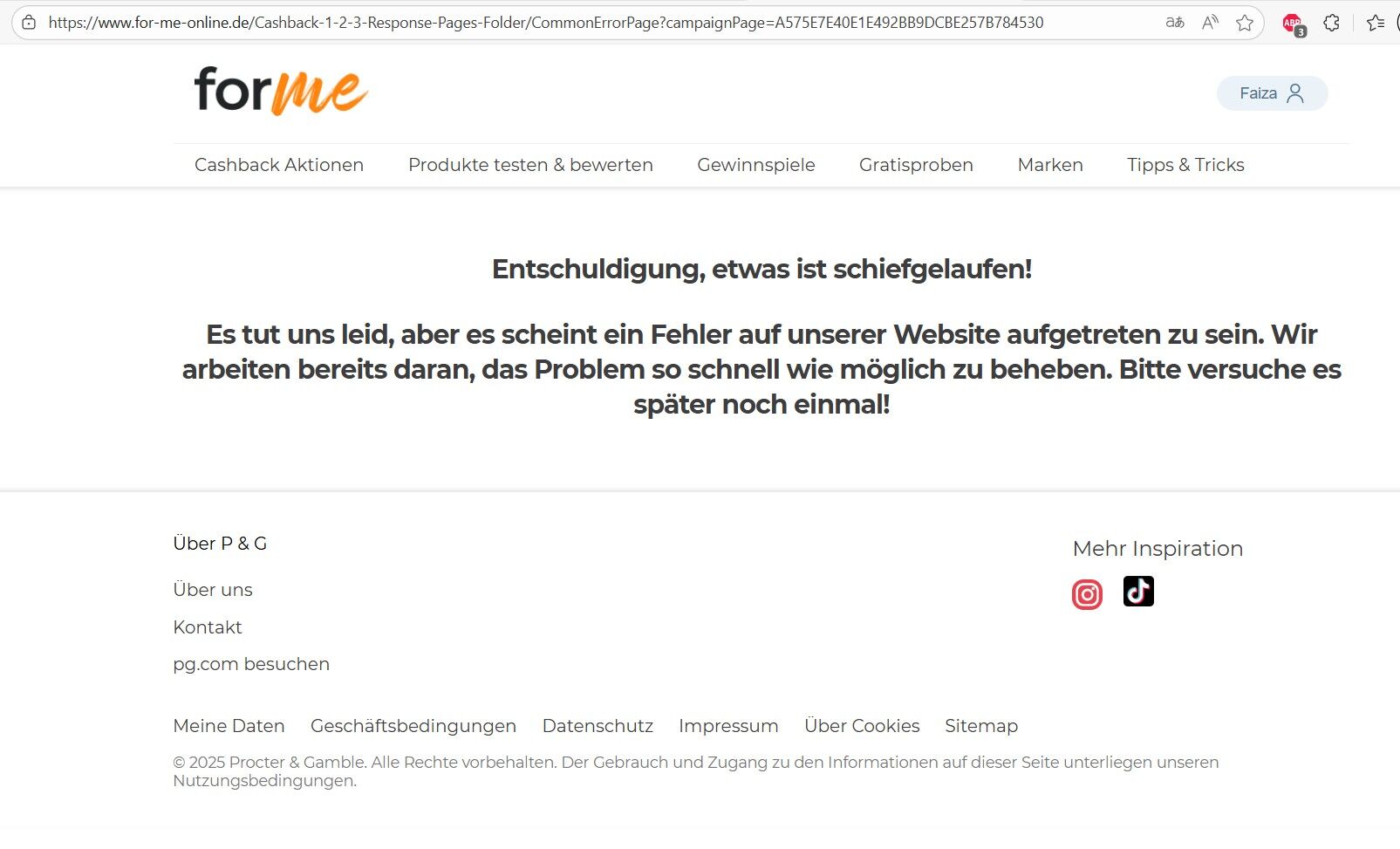 Nachdem ich die Quittung, das Produktfoto und meine Bankdaten hochgeladen hatte, erhielt ich am Ende diese Fehlermeldung.