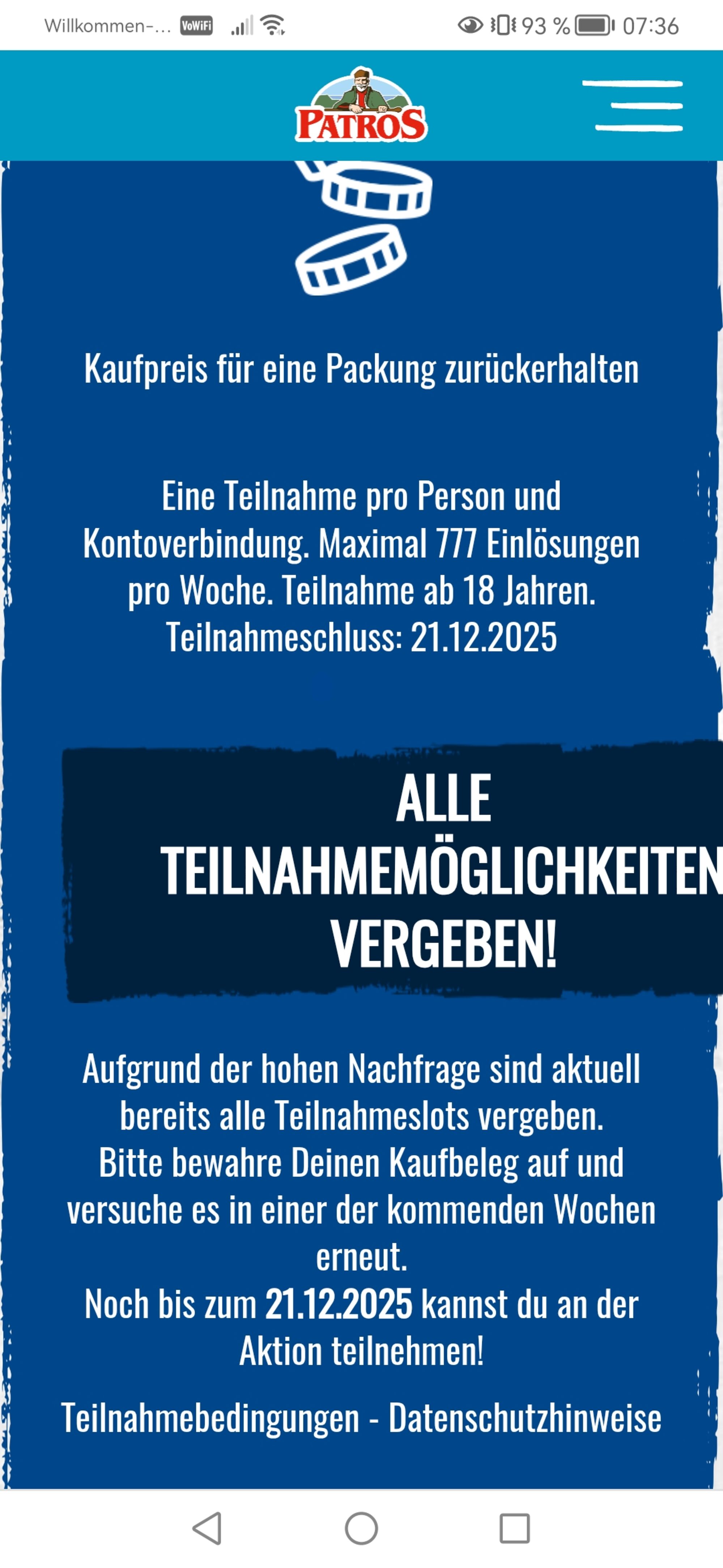 - Ladet bis zum 21.12.2025 ein Foto des Produkts zusammen mit dem vollständigen Kaufbeleg auf der Aktionsseite http://www.patros.de/aktion hoch.
