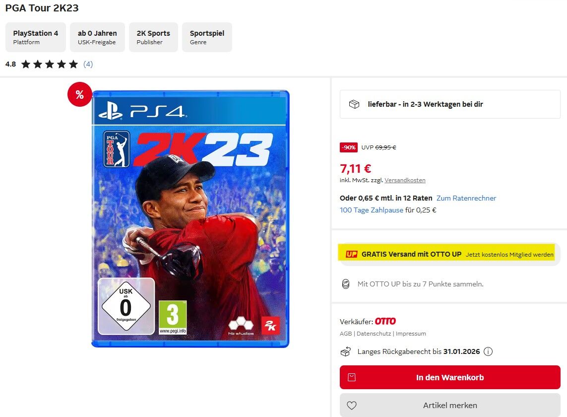 Bei OTTO bekommt ihr für die PS4 das Golfspiel PGA Tour 2K23 für 7,11€ bei Lieferung mit der OTTO UP Lieferflat. Ohne Lieferflat fallen 4,95€ Versandkosten zusätzlich an.