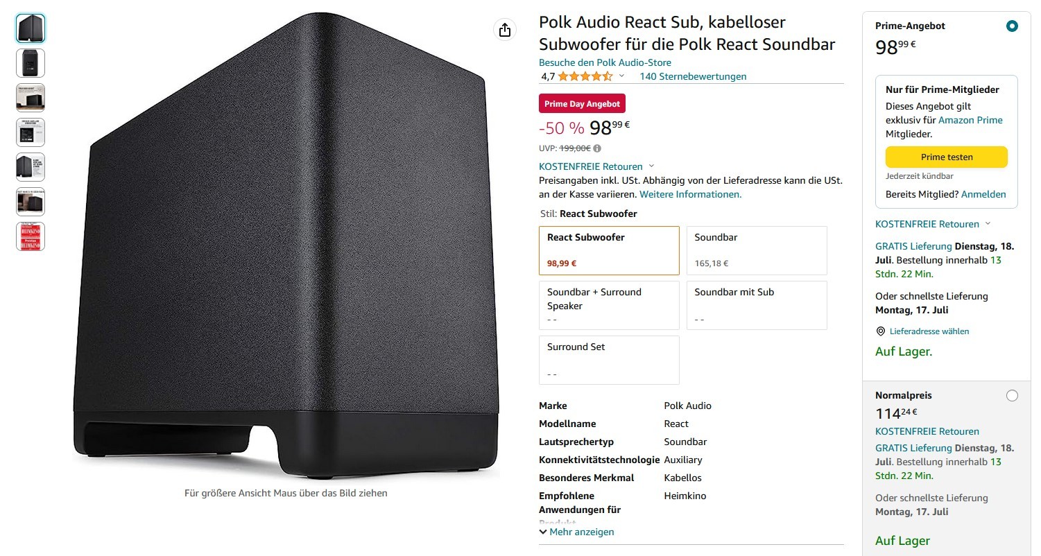 Der kabellose Polk Audio React Subwoofer ist zum Amazon Prime Day für 98,99€ inkl. Versand erhältlich. Deal ist schon angepasst 😉
