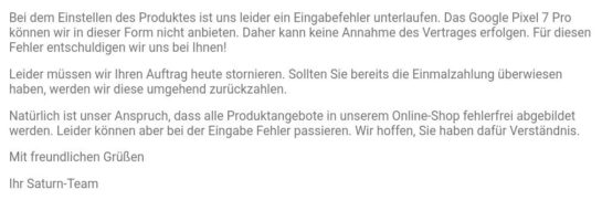 Sie haben uns heute ĂŒ ; ber den Online-Shop https :// handytarife.saturn.de / ein Angebot zum Abschluss eines Vertrags ĂŒ ; ber ein Google Pixel 7 Pro ĂŒ ; bermittelt.