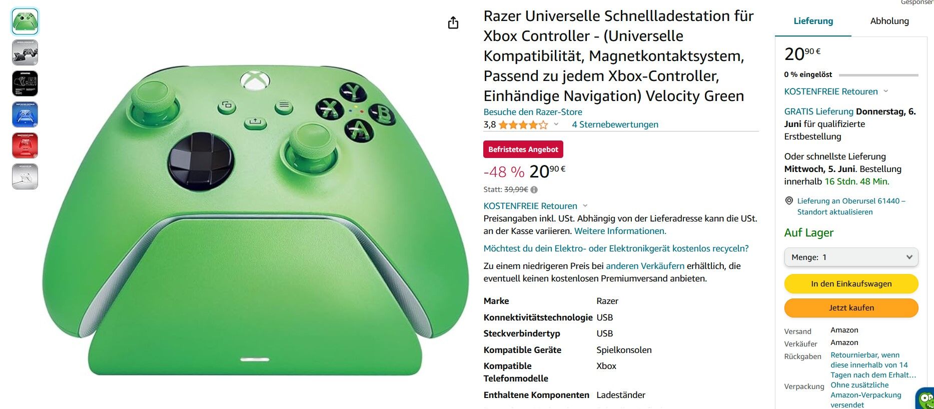 Die Ladestation ist bei Amazon in der Farbe grün gerade für 20,90€ inkl. Versand (Prime) im Anebot. Deal ist bereits überarbeitet 😉