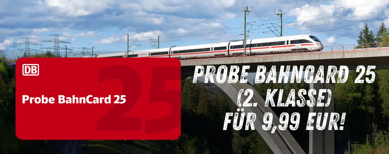 Wenn du ein Deutschland-Ticket besitzt, kannst du dir im Zeitraum vom 16.02. bis 16.03.2026 die Probe BahnCard 25 (2. Klasse) zum Sonderpreis von nur 9,99 ⏠sichern (statt 19,99 âŹ).