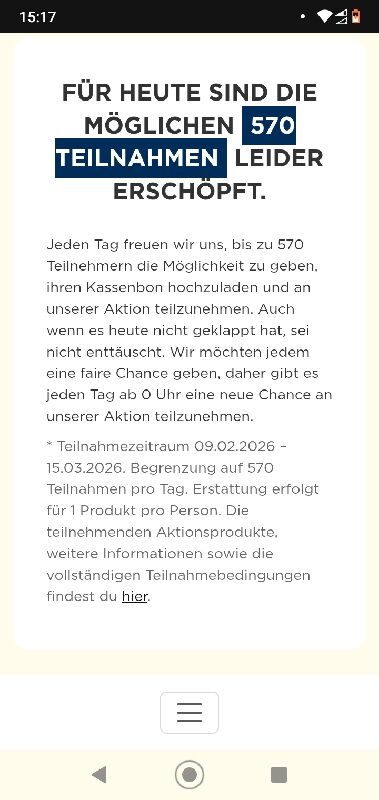 Aber, wichtig: Hier mĂŒsst ihr wohl wirklich sehr, sehr schnell sein! đ Denn die Zahl der Teilnahmen ist limitiert: Insgesamt werden bei der Aktion 10.000 Einlösungen zugelassen sein, pro Woche jeweils 2000. Ausnahme: Im Zeitraum vom 16.02.2026 bis zum 22.02.2026 gibt es eine maximale Anzahl von 570 Teilnahmen pro Tag.