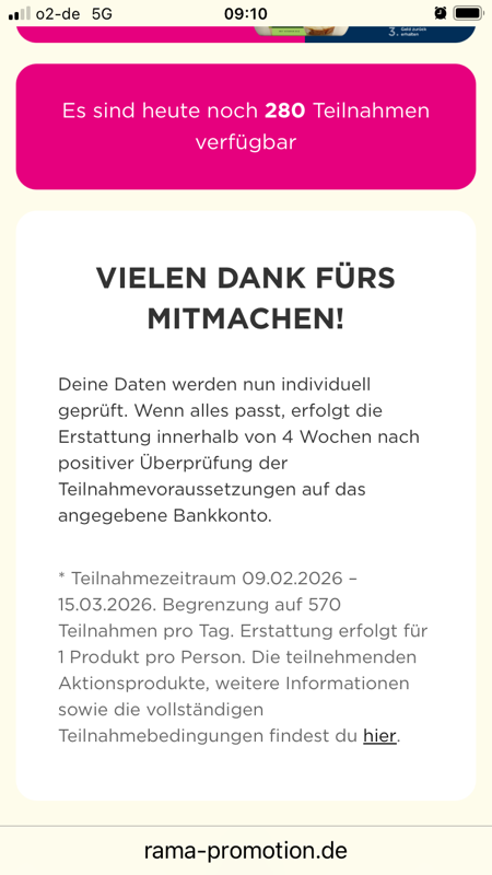 „Lieber Teilnehmer / Liebe Teilnehmerin, vielen Dank fĂŒr deine Teilnahme an unserer âRama-Gratis probieren!“ Aktion. Deine Daten werden nun geprĂŒft. Im Anschluss erhĂ€ltst du bei ErfĂŒllung aller Teilnahmevoraussetzungen die RĂŒckerstattung deines gezahlten Betrages innerhalb von 6 Wochen auf das von dir angegebene Bankkonto. Sollte deine Teilnahme fehlerhaft oder ungĂŒltig sein, melden wir uns erneut per E-Mail bei dir. Du hast Fragen zu deiner Teilnahme? Dann kannst du dich gerne per E-Mail an [email protected] wenden. Viele GrĂŒĂe Dein Rama-Team „