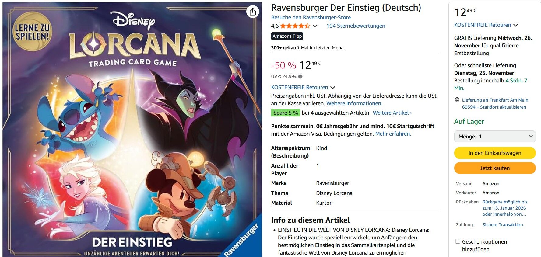 Bei Amazon bekommt man das Trading-Kartenspiel von Ravensburger – Disney Lorcana: Der Einstieg (Deutsch) für 12,49€ inkl. Prime-Versand.