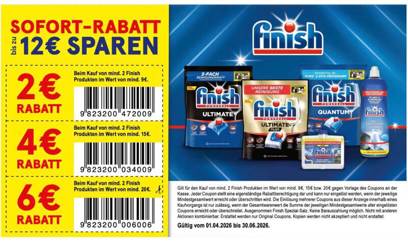 [Rossmann] Finish Spülmaschinen-caps oder -Tabs je 36- 64 Stück für 4,49 Euro statt 8,69 Euro bei Rossmann mit Coupon beim Kauf von 3 Produkten