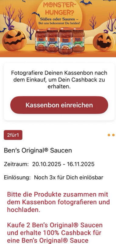 - Beide Ben’s Original® Saucen müssen auf einem Kassenbon sein