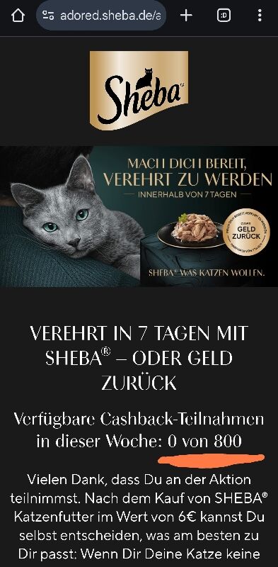 Der Aktionszeitraum der Sheba gratis testen Aktion läuft vom 15.01.2026 bis 30.04.2026. Kassenbon(e) bis zum 15.05.2026 aufbewahren. Die Erstattungen sind auf 800 Teilnahmen pro Woche begrenzt. Wartet also nicht zu lange, wenn ihr bei der Sheba Cashback Aktion dabei sein wollt! 😺