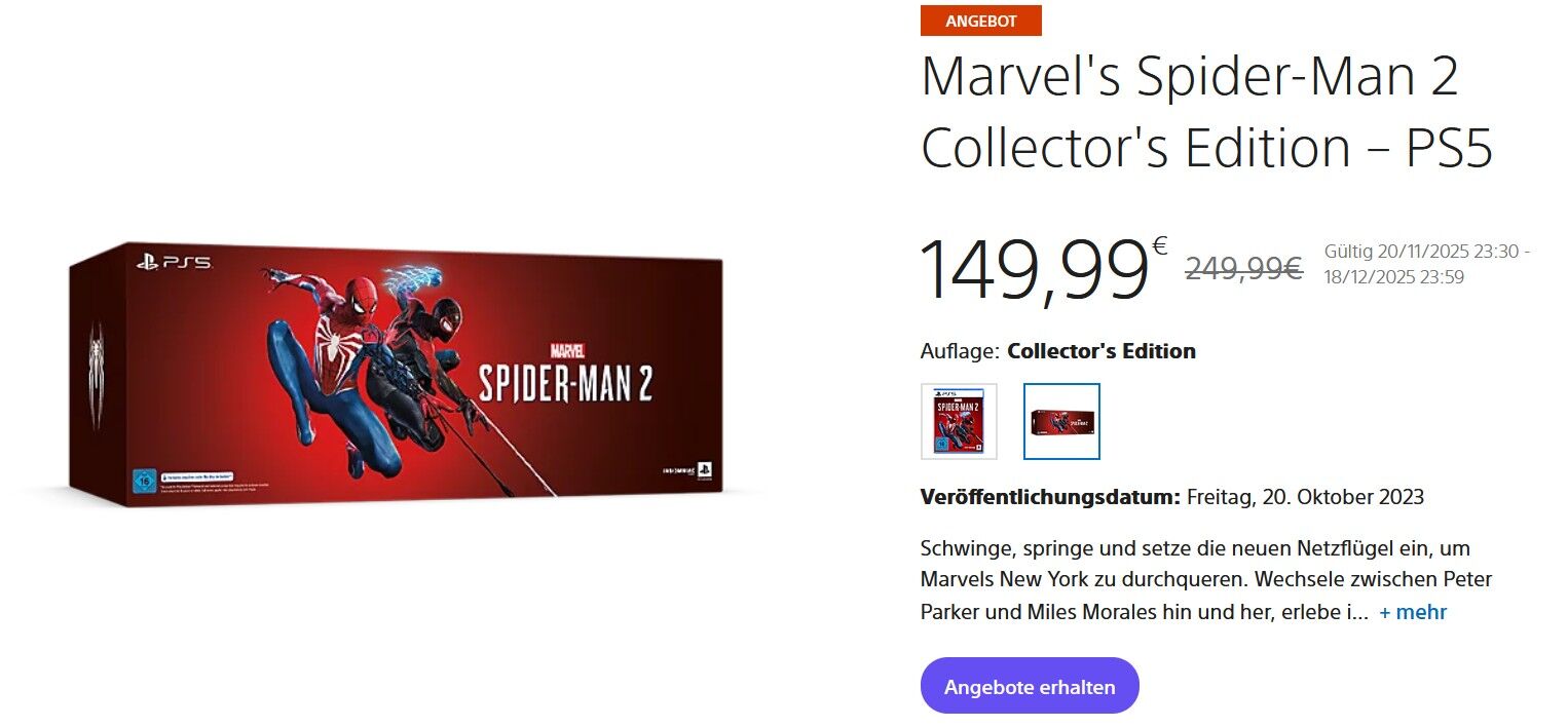 Im PlayStation Store bekommt man für die PS5 die Collectors Edition von Spider-Man 2 für 149,99€ statt 249,99€ im Angebot. Das Angebot gilt noch bis 18.12.2025 um 23:59 Uhr.