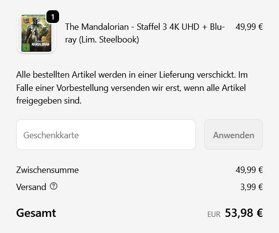 Im Onlineshop von LEONINE STUDIOS ist die 3. Staffel von THE MANDALORIAN zum Preis von 49,99€ + 3,99€ Versand verfügbar 😉