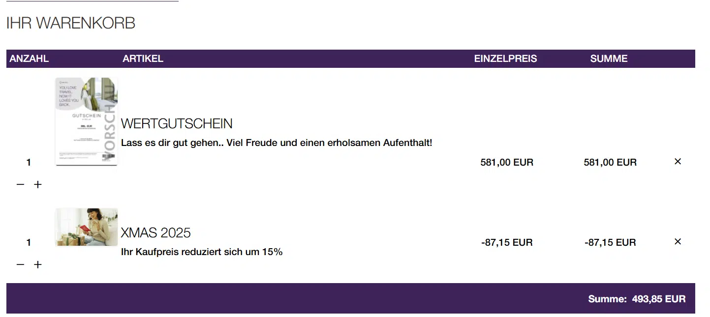 Der Kauf läuft angenehm unkompliziert ab. Ihr wählt einfach das Gutscheinmotiv, legt euren Wunschbetrag in den Warenkorb und gebt dort den Code XMAS15 ein. Der Rabatt wird sofort abgezogen und ihr könnt den Gutschein direkt nach dem Kauf herunterladen oder bekommt ihn per Mail – perfekt, wenn’s schnell gehen muss oder ihr noch ein Last-Minute-Weihnachtsgeschenk braucht.