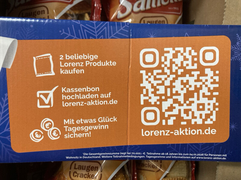 Beim Kauf von 2 Lorenz Produkten kann man den Kassenzettel hochladen und täglich an Verlosung von Cashgewinnen teilnehmen.
