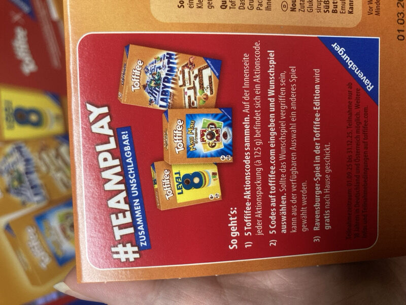 Ab 01.09.25 könnt ihr beim Kauf von Toffifee Aktionscodes sammeln. Habt ihr 5 Aktionscodes gesammelt, könnt ihr euch ein Ravensburger Spiel aussuchen.