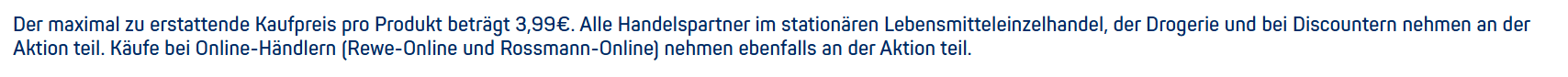 Teilnahmebedingungen: „Alle Handelspartner im stationĂ€ren Lebensmitteleinzelhandel, der Drogerie und bei Discountern nehmen an der Aktion teil. KĂ€ufe bei Online-HĂ€ndlern (Rewe-Online und Rossmann-Online) nehmen ebenfalls an der Aktion teil.“