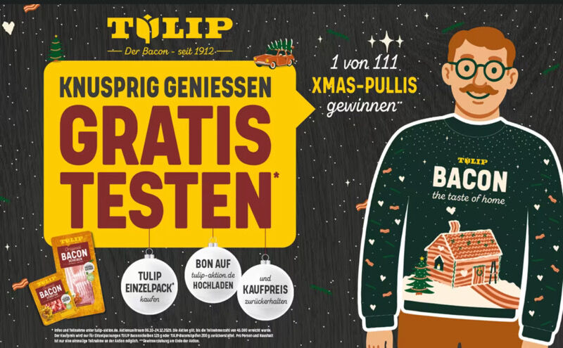 Tulip gratis testen ist euch noch nicht genug? – Keine Sorge, zusĂ€tzlich zu eurem kostenlosen Bacon habt ihr die Chance, 1 von 111 X-MAS Pullis zu gewinnen – die Gewinner werden am Ende der Aktion gezogen! đ