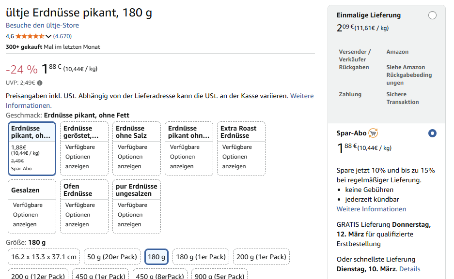 Derzeit bekommen Amazon Prime und Spar Abo Mitglieder folgendes Angebot: ültje Erdnüsse pikant, ohne Fett 180g für 1,88€