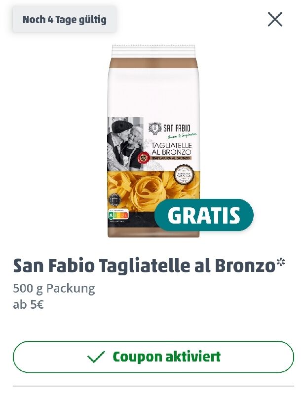 Ich hab einen Coupon für gratis Tagliatelle al Bronzo, aber erst ab einen Einkauf ab 5€.
