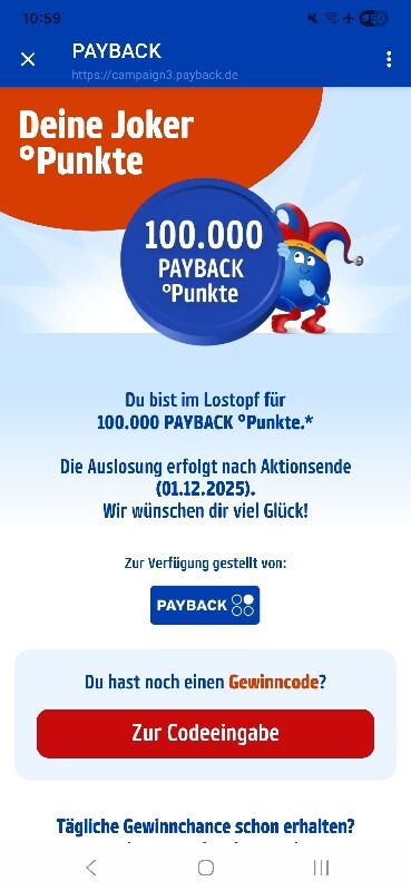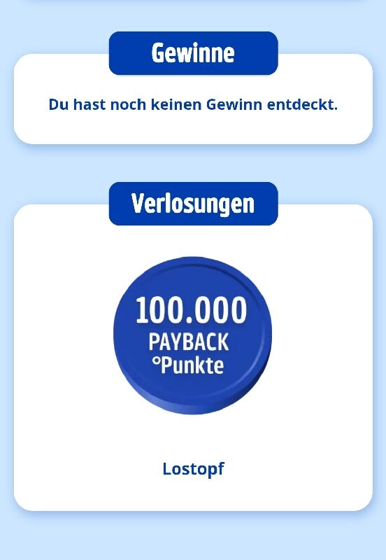 AuĂerdem habt ihr eine weitere Gewinnchance ohne Code 1x pro Tag in der PAYBACK App. HierfĂŒr benötigt ihr keinen Einkauf bzw. kein Coupon-Heft. Wenn ihr gewonnen habt, wird es sofort angezeigt.
