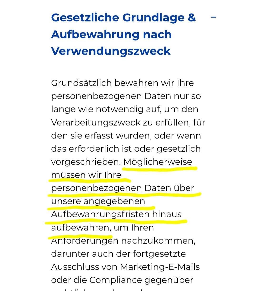 @Sanne91: Bitte weiterlesen, Sanne: Das gilt fĂŒr Personen, wo sie den Verdacht der Mehrfachteilnahme/Betrug hatten. Die FĂ€lle sind spezifiziert. FĂŒr alle anderen gilt die Löschung. Die EU-Verordnung gibt auch detaillierte Infos, was ein „berechtigtes Interesse“ ist. Da ich normal teilgenommen und mein Geld erhalten habe, sind meine Daten gelöscht. Das gilt auch fĂŒr alle anderen erfolgreichen Teilnahmen.