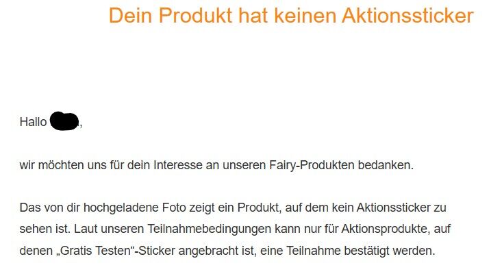 ich habe an Ihrer âFairy gratis testen“-Aktion teilgenommen und die entsprechende Flasche im Handel (DM) gekauft. Auf dem Wobbler im Regal wird die Aktion mit dem Hinweis âgratis“ beworben, und der Einlösezeitraum ist korrekt angegeben.